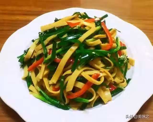 韭菜1小把、豆腐皮1張、紅辣椒1個、鹽適量、料酒適量、生抽適量。