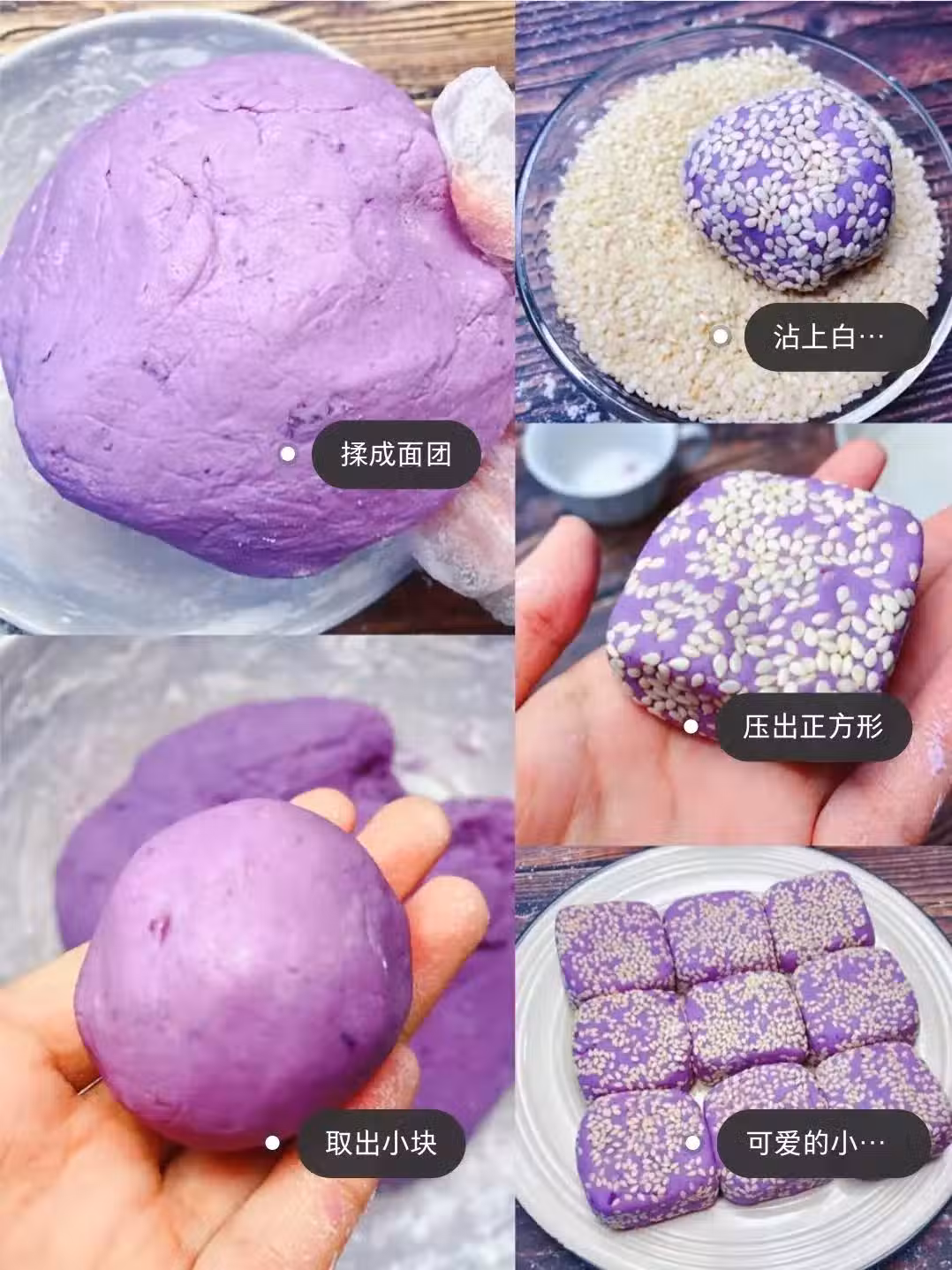 3、帶上手套揉成麵糰,取一小塊揉圓,加入白芝麻裡面,然後壓扁一點,四邊壓成方形狀!