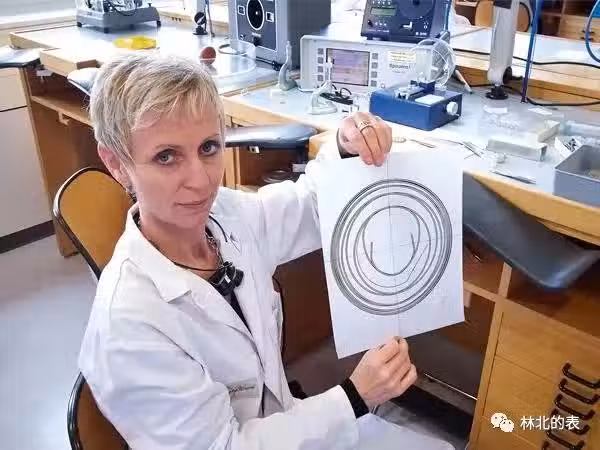 遊絲卷繞完成以後就是進行末端曲線的比對,JOB女師傅手上所展示的即是球狀遊絲的平面圖,兩個末端曲線可以看見是向內收縮,當老師傅在卷制完成後,會將遊絲拿到投影機下,跟平面圖進行比對,看是否出錯。