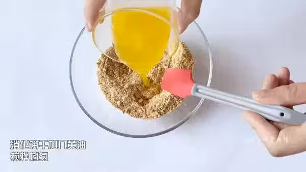 5、模具鋪上油紙,更容易脫模,倒入餅乾碎,抹平,壓緊壓實,放入冰箱冷凍,一會再用。