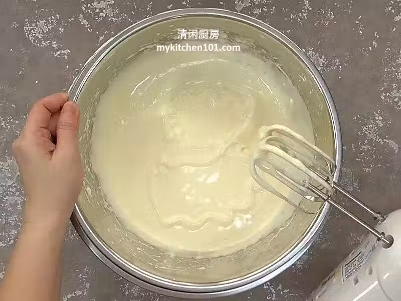 8 把淡奶和玉米油加入香蕉泥拌勻。
