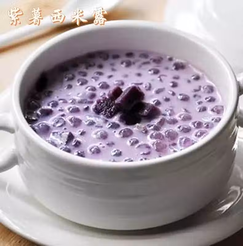 材料:小西米100克,紫薯 1個,牛奶 200毫升,椰漿 200毫升,蜂蜜 適量