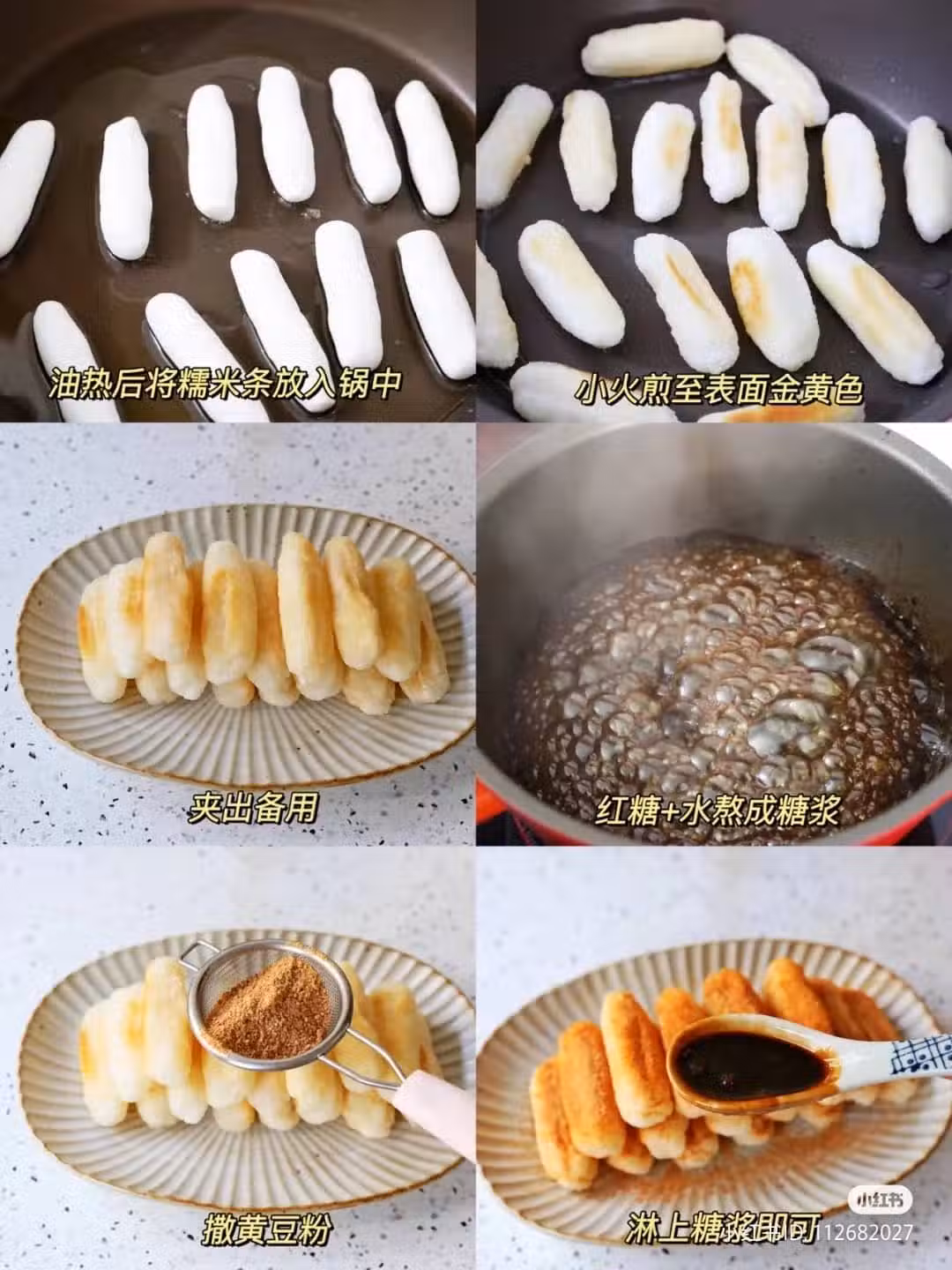 3️⃣紅糖+溫水熬成糖漿,糍粑撒上黃豆粉,淋入紅糖漿即可