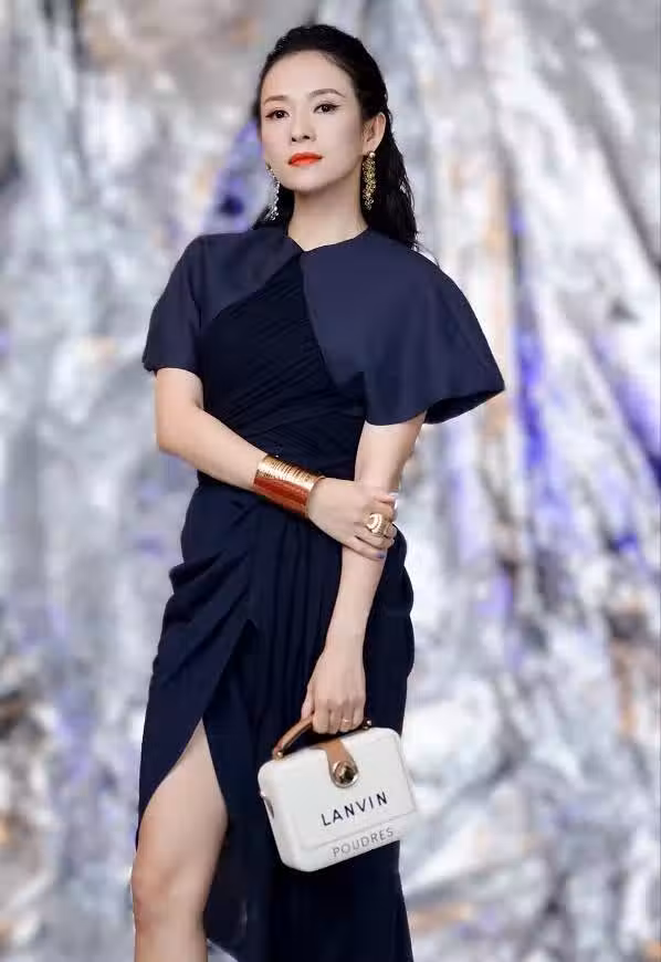 裙裝的與眾不同之處,大部分在於它的創新版型。娃娃領燈籠袖高開叉等元素,都能為造型加分,裙裝的每一部分都能融入高階設計感。章子怡身著的這款連衣裙是藍黑兩種色彩的拼接款式,貴氣典雅而且顯白。裙擺半側高開叉,靈動又溫婉,纖長大腿曲線滿是誘惑美。古銅色手環與手提包中的金屬形成呼應,整體搭配相當高貴,並且面孔中帶有濃厚冷艷風情。