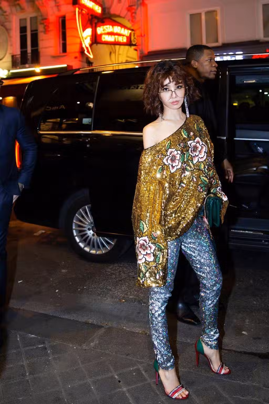 蔡依林留一頭復古泡麵卷發,戴大框眼鏡。一件印花刺繡的亮片金黃上衣,下搭銀色亮片緊身褲,腳踩紅綠撞色高跟鞋。這樣的穿搭大膽有個性,真的是想不出還有誰敢這樣穿。即便是敢穿這樣的衣服,也穿不出蔡依林的風格和味道出來。