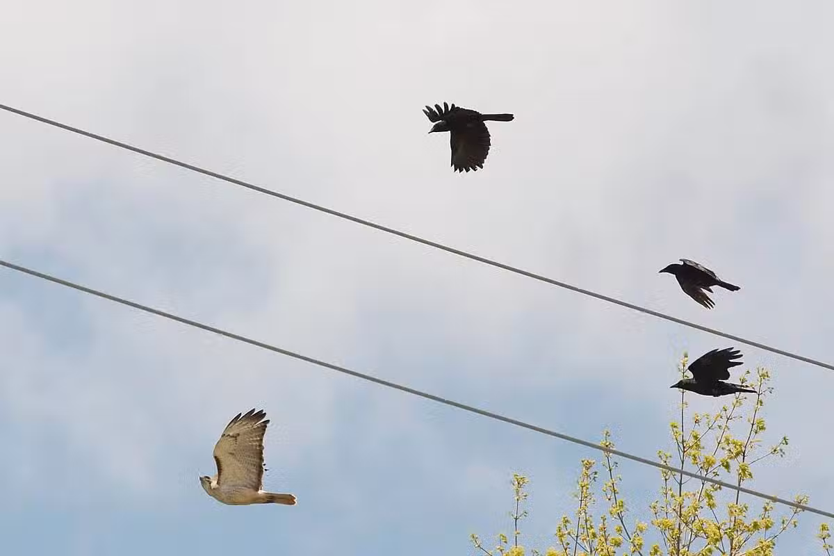 短嘴鴉(Corvus brachyrhynchos)圍攻紅尾鵟(Buteo jamaicensis)