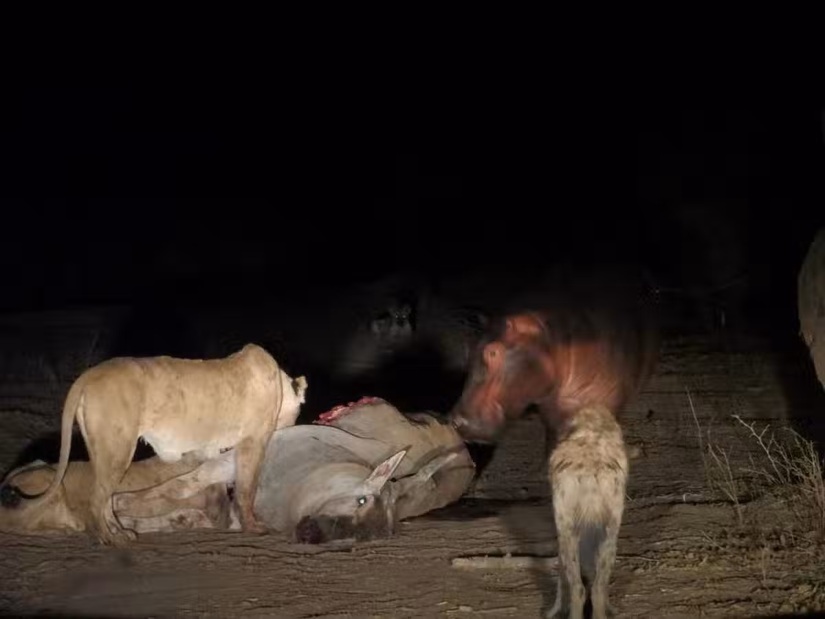 動物志解讀:看來在陸地上,如果鱷魚體型不夠巨大,會首先被出局。河馬雖然是吃素的,但憑借其巨大的體型,偶爾想換換口味沒有動物能阻止它們。但河馬的牙齒終究不適合撕扯和切割獵物,因此最後問題還是要在獅子和鬣狗之間解決,它們可是老冤家了。雖然在觀察中獅子一直占據著獵物,但它們終會吃飽離開。而且獅子只吃羚羊肉,鬣狗的咀嚼能力遠勝獅子,能吃掉獅子無法食用的羚羊角、皮和骨頭。第二天早上,攝影師約翰起床後又看到了那些獅子和鬣狗,它們的肚子已經吃得圓滾滾,看來無論對獅子或鬣狗,昨晚都堪稱一場饕餮盛宴。