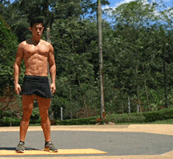 站立,雙腳稍微分開,之後俯身下蹲俯臥