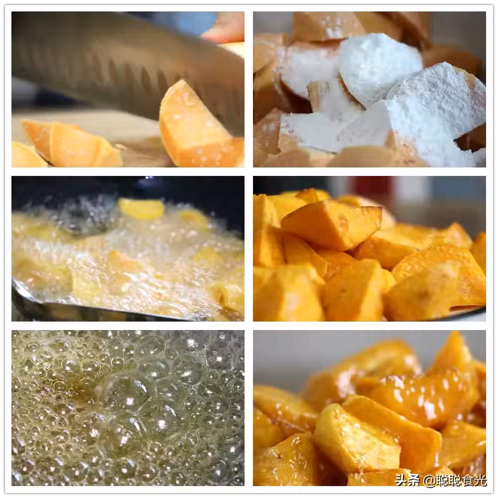 【操作步驟】1、把黃心地瓜削去外皮,切成大小均勻的滾刀塊,然後放入大碗中,加入適量干澱粉,用手抓勻。
