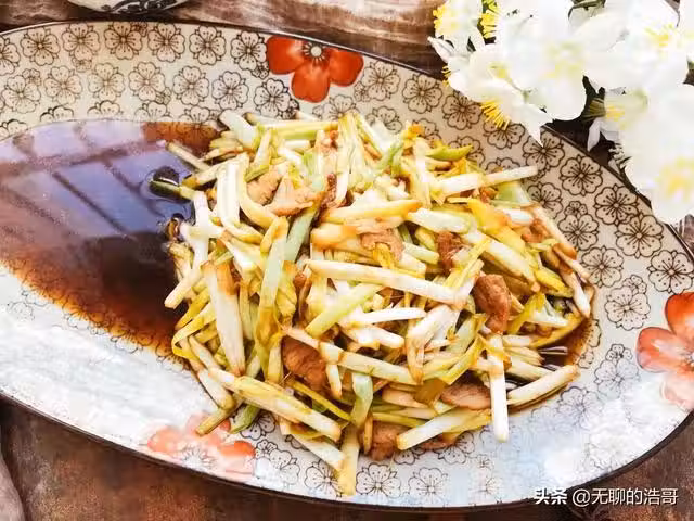 原料:豬肉300克,蒜黃150克,植物油、精鹽,雞精、醬油、薑絲各適量。