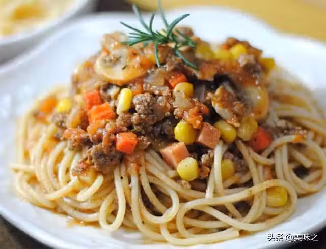 義大利面、牛肉、蔥、蘑菇、番茄、玉米粒、胡蘿蔔粒、火腿粒、橄欖油、黃油、蒜、鹽、糖、羅勒、黑胡椒粉。
