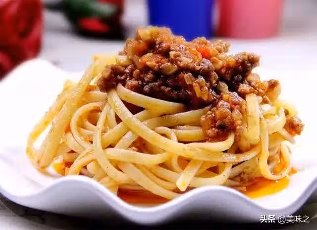9、另起鍋放入適量炒好的肉醬倒入煮熟的麵條。