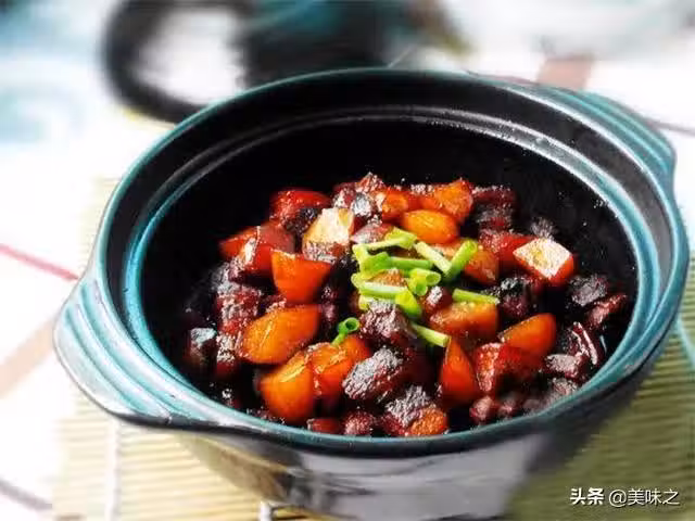 8、移至砂鍋中撇去浮沫,調入紅燒醬油;轉小火蓋上蓋子慢燉40分鐘,燉至五花肉軟糯;