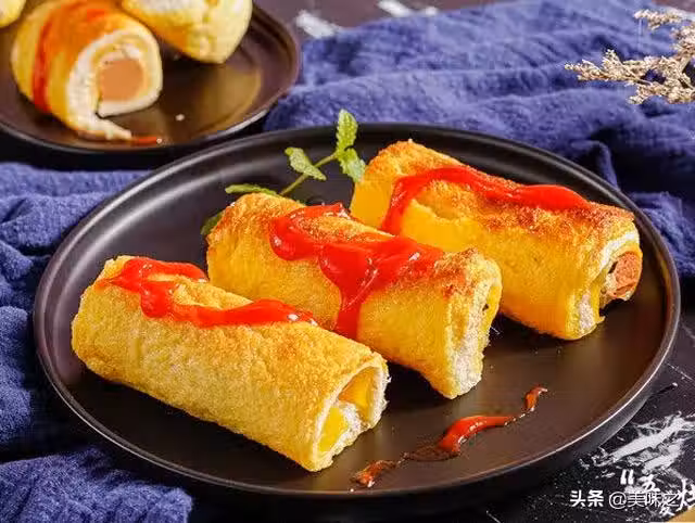 4、卷好的土司卷,放到蛋液中滾一下。