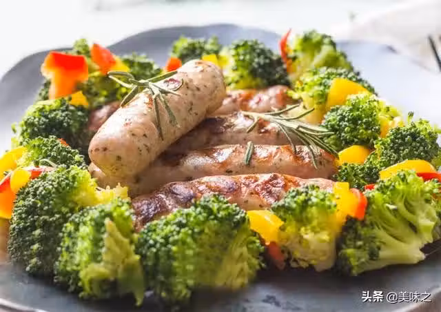 純肉香腸、西蘭花、聖女果、紅柿子椒、橄欖油、黃柿子椒。