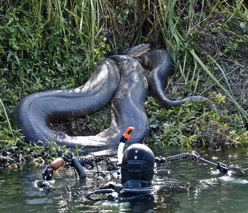 小夥潛水偶遇8米森蚺,身材粗長眼睛放光,冒死零距離拍照 光看著就令人毛骨悚然