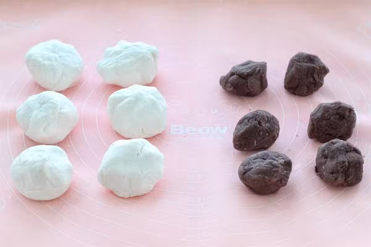 5.將糯米麵團按扁包入一個豆沙餡,用虎口向上收攏直至封口。