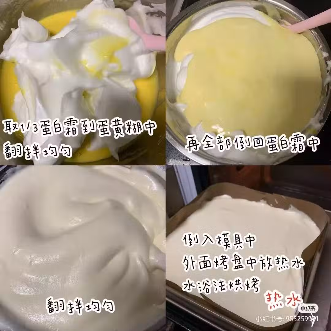 7.模具鋪好油布(或者剪裁好的油紙)蛋糕糊從高處倒入模具中 震出氣泡 將模具放在裝入涼水的烤盤中 水浴法放入烤箱中層150°烘烤60-65分鐘