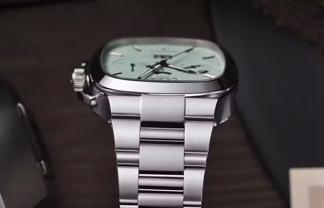 腕錶搭配精鋼表鏈,經過拋光和拉絲處理,細節十分到位。同時,腕錶還附贈一條灰色路易斯安那鱷魚皮錶帶搭配蝴蝶扣。大家可以根據不同場合選擇不同錶帶。