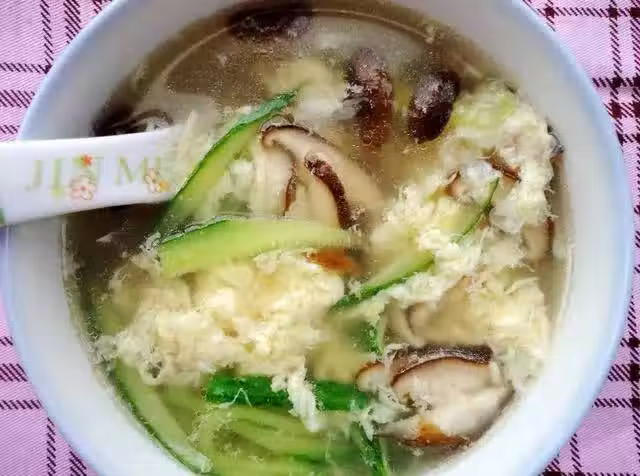 用料:黃瓜、火腿、香菇、雞蛋、香蔥、食鹽、麻油