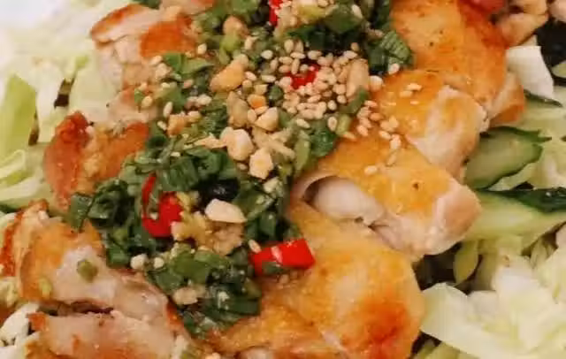 用料:大雞腿2隻、捲心菜小半個、黃瓜半根、泰式椒麻醬汁、小米辣3、4個、香菜3株、蔥花4株、檸檬1個、生抽15ml、香醋30ml、花椒油15m、l糖20g、熟白芝麻適量、熟花生碎適量、鹽適量、黑胡椒適量、蒜泥3、4個