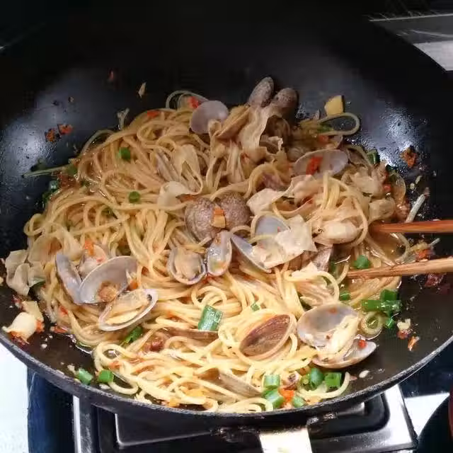 蔥姜切碎越碎越好,下大蔥蔥頭爆香,下蔥姜沫爆香,下花蛤炒一下。花蛤記得洗一洗不要直接丟進去。花蛤開口後調味,加鹽、生抽老抽蚝油料酒等等再加辣椒粉什麼的,不想吃太辣可以不要辣椒。加水煮一下。加煮好的意面,不要加煮意面的水。拌一下。可以吃了。