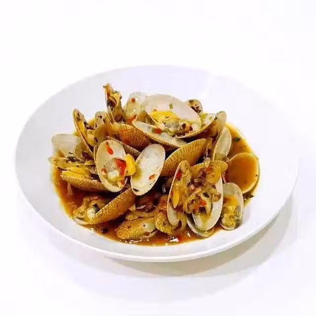 1.鍋中放一些油先爆香蒜頭和洋蔥,而後加入辣豆瓣醬,炒香後加一些水,水滾後調味,花雕酒+生抽+糖,此時加入花蛤,馬上蓋上蓋子燜煮,待花蛤全部開口時打開鍋蓋,撒入紅辣椒粒和九層塔碎+麻油+水澱粉,翻炒均勻就完成了~