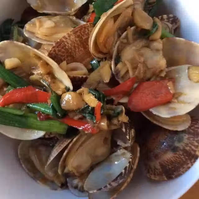 無需加鹽或者加少量鹽,因花蛤本身就具有鹹味.翻炒一會兒花蛤出水,蓋上鍋蓋悶50秒左右,開鍋蓋繼續翻炒到水分變干.出鍋,享受!
