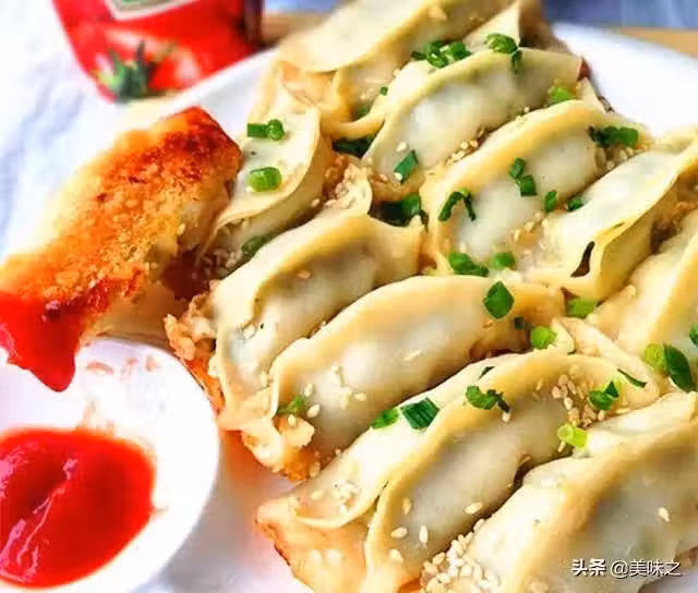 豬肉適量、韭菜適量、餃子皮適量、芝麻適量、大蔥適量、鹽適量、花生油適量、醬油適量、米酒適量、蚝油適量、亨氏番茄醬適量。