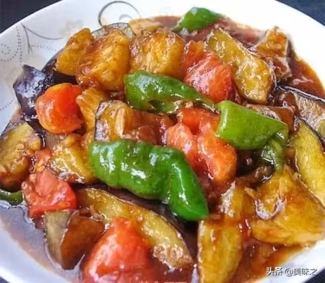 茄子1個、西紅柿1個、青椒1根、蔥1根、生薑1塊、大蒜1頭、玉米澱粉適量、料酒1湯匙、香醋1湯匙、老抽半湯匙、白糖1勺、食鹽適量、雞精少許。