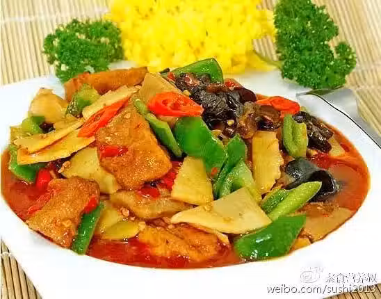 食材:豆腐,冬筍,平菇,青甜椒,紅杭椒,黑木耳,郫縣豆瓣醬
