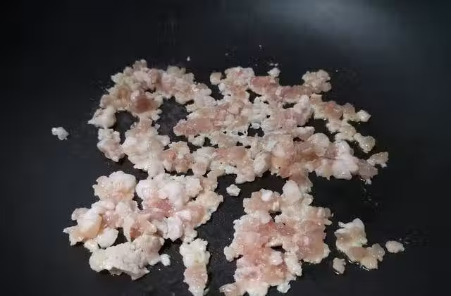 4、等到豬肉末完全變成白色後,放入剛剛處理好的胡蘿蔔,香菇,豌豆,翻炒三四分鐘。