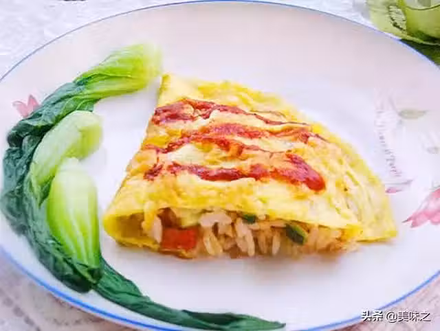 7、蛋液快凝固時,在一側放入適量炒好的飯。