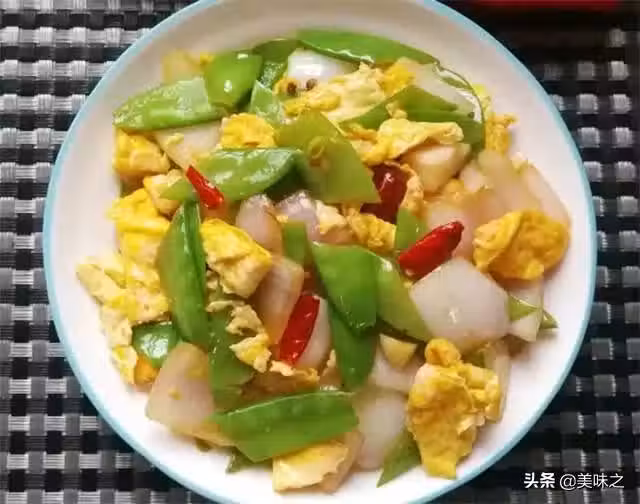 荷蘭豆適量、洋蔥半個、柴雞蛋4個、玉米油適量、蒜2粒、花椒適量、干紅辣椒2個、鹽適量、生抽適量。