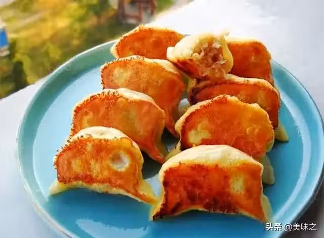 10、鍋中淋入少許油,取部分餃子入煎鍋;淋入冷水,沒過餃子1/2,煎至底殼焦黃即可。