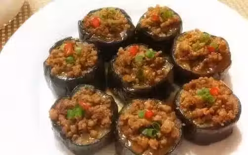 3、炸好的茄片,每兩片中間放入肉餡、碼在碗內,上籠用旺火蒸分鐘,扣在盤內。