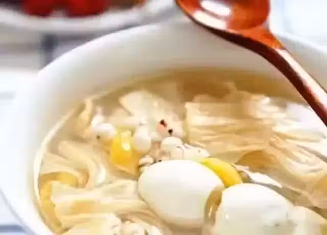 4、煲滾水,將白果、薏米放入煲半小時,然後加入腐竹、冰糖,煲至冰糖溶化,將熟雞蛋去殼並放入糖水中, 煮至薏米剛熟即成。