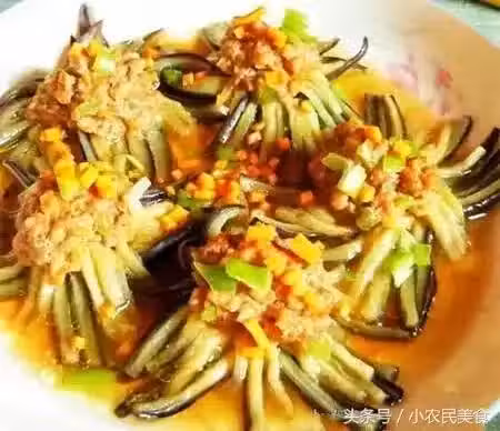 1、茄子洗凈切成6厘米左右的長段,然後在一段切成細長條,注意底部要連接在一起,不要切斷,切好的茄子用鹽腌制一下,使其變軟。