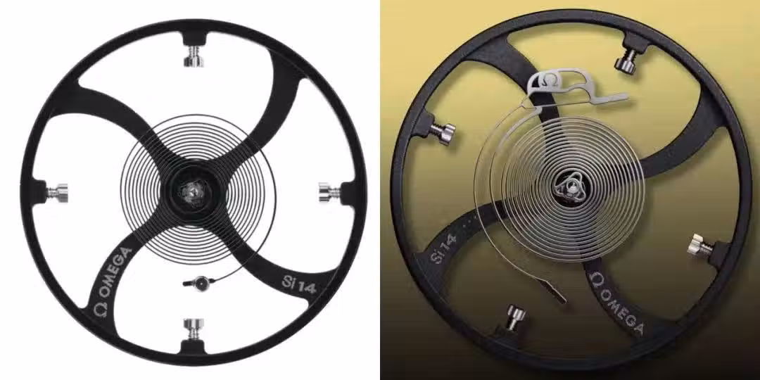 左邊是老款的矽遊絲,右邊是新款的Spirate™系統所使用的矽遊絲,遊絲多了一個奇形怪狀的外圈,而這個外圈便是奧妙所在。歐米茄重新設計了腕錶的擺輪遊絲,遊絲末端裝有伸縮軸承的高度精確鉸接結構。
