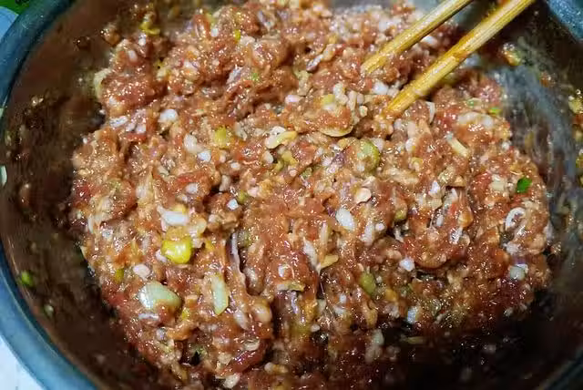 2.肉餡中加入鹽3克生抽2勺老抽2勺雞蛋1個白鬍椒粉適量植物油適量蔥姜蒜末適量拌勻。