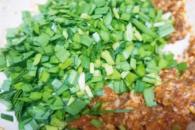 4.將切好的韭菜拌入肉餡中拌勻。