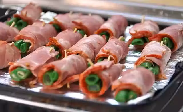 3.烤箱先預熱後,將作法2的四季豆培根卷放入烤箱中,以200℃烤約10∼15分鐘後取出,撒上胡椒鹽即可。