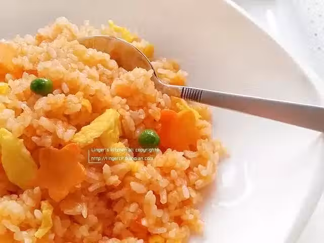 把準備好的米飯倒入炒鍋中,調入適量鹽,小火慢慢將米飯與西紅柿醬炒勻(這個環節要耐心,讓米飯在受熱過程中充分吸收醬汁中的水份);然後開大火把米飯中的水份適度炒干,放入配料翻炒均勻出鍋。
