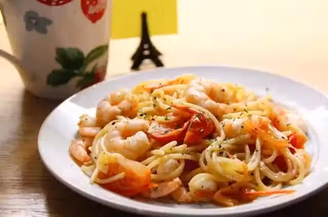 番茄(中等大小)兩個;熟蝦仁適量;意麵一人份;蒜一瓣;橄欖油少許;鹽和胡椒少許;歐芹碎少許