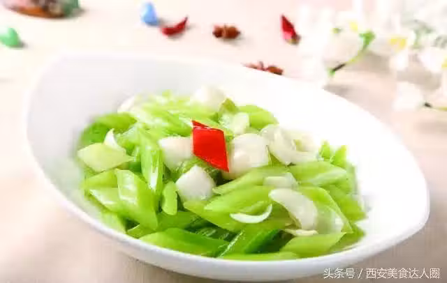 食材:西芹一棵、幹百合一把、花生油適量、鹽適量、雞精少許、小蔥兩根、蒜兩瓣