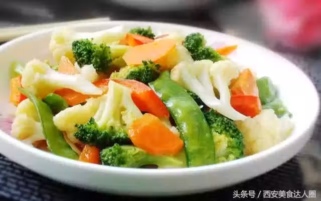 原料:西蘭花適量、菜花適量、胡蘿蔔適量、紅椒適量、荷蘭豆適量、薑片適量、白砂糖適量、素高湯(調味料)適量、水澱粉適量、鹽適量、油適量.