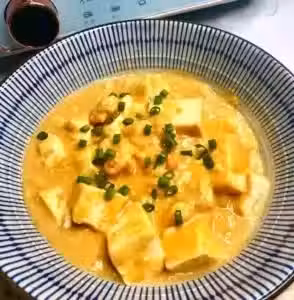 熱油,鹹蛋黃碾碎入鍋炒至冒泡。放入蝦仁炒至蝦變紅,倒水沒過蝦。倒入豆腐,加蓋燜煮5分鐘。