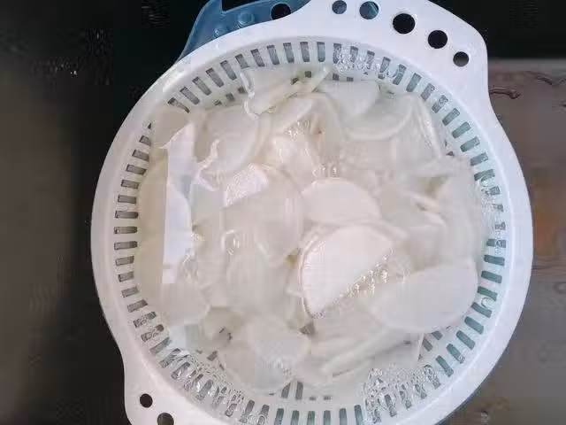 3、蘿蔔出水之後,倒掉腌出來的水分,把蘿蔔片放涼白開中清洗一遍,洗掉鹽分,然後擠干,這樣後面調味能更好的掌握用量;