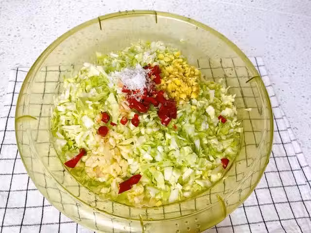 2、切碎的捲心菜放在一個大盆中,加入蒜末、薑末、辣椒、食鹽,攪拌均勻,不用去揉搓它,拌勻就可以了;