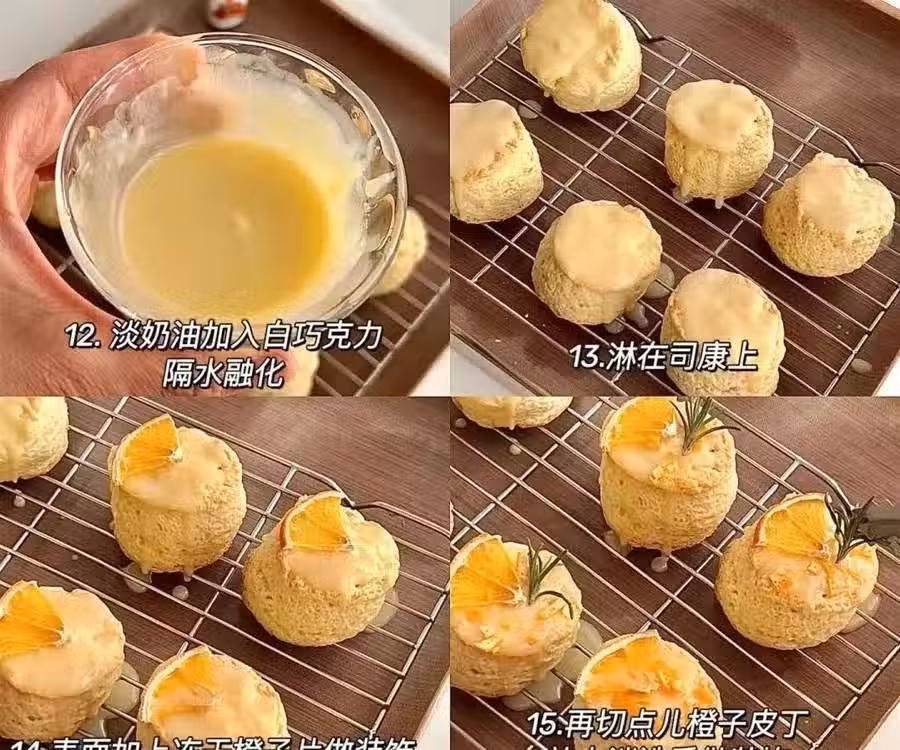 8、削一點橙子的表皮,切成丁,撒在司康上,再放上一枝迷迭香做裝飾即可完工。